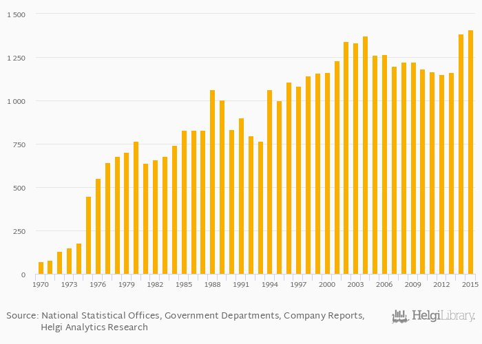 Historically, silver (mine) production in Poland reached an all time high of 1,407 kt in 2015 and an all time low of 70.0 kt in 1970.