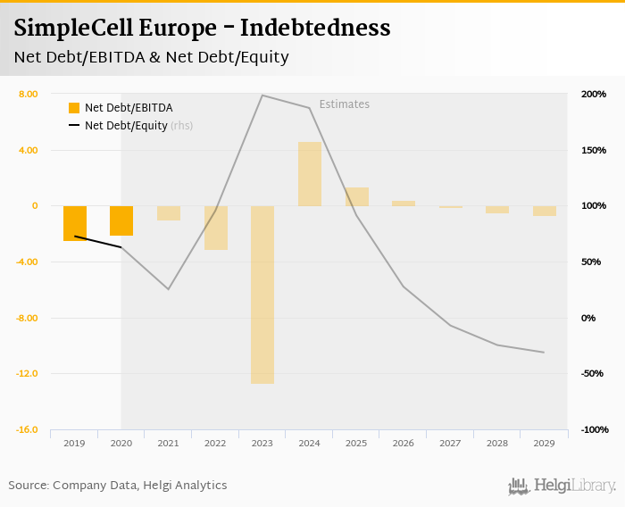 SimpleCell Europe's net debt stood at CZK 47.0 mil and accounted for 62.6% of equity at the end of 2020. The ratio is down 10.1 pp compared to the previous year.