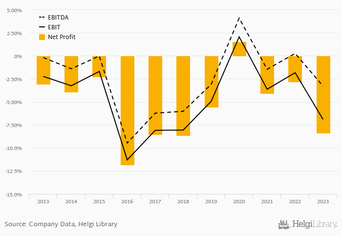 On the operating level, the EBITDA margin reached -3.29% and EBIT amounted to -6.92% of sales in 2023.