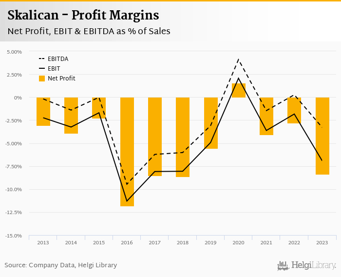 Skalican made a net profit of CZK -62.9 mil with revenues of CZK 750 mil in 2023, down by 141% and down by 20.4%, respectively, compared to the previous year.