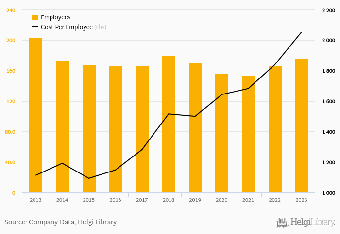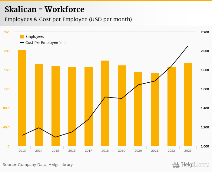 Skalican employed 176 employees in 2023, up 5.39% compared to the previous year. Historically, between 2013 and 2023, the firm's workforce hit a high of 203 employees in 2013 and a low of 154 employees in 2021.