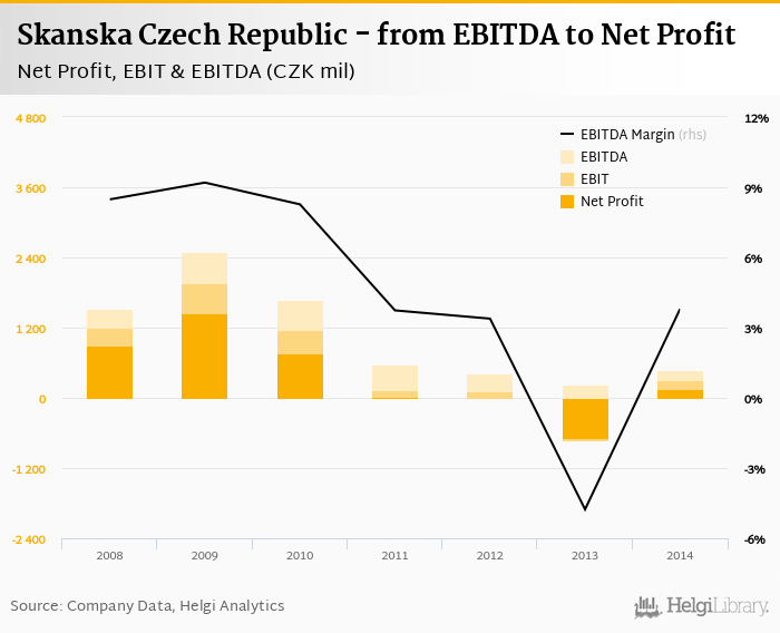 Skanska Czech Republic made a net profit of CZK 149 mil with revenues of CZK 12,400 mil in 2014, up by 122% and up by 22.9%, respectively, compared to the previous year. This translates into a net margin of 1.20%.