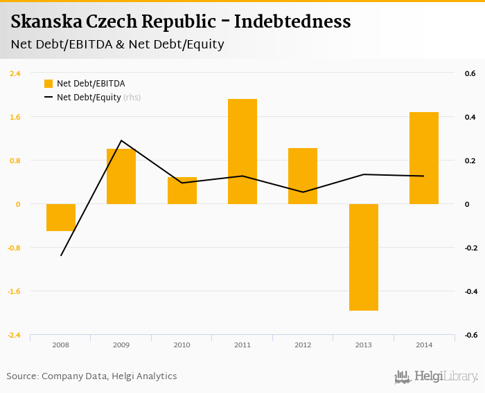 Skanska Czech Republic's net debt stood at CZK 797 mil and accounted for 0.125 of equity at the end of 2014. The ratio is down 0.007 pp compared to the previous year.