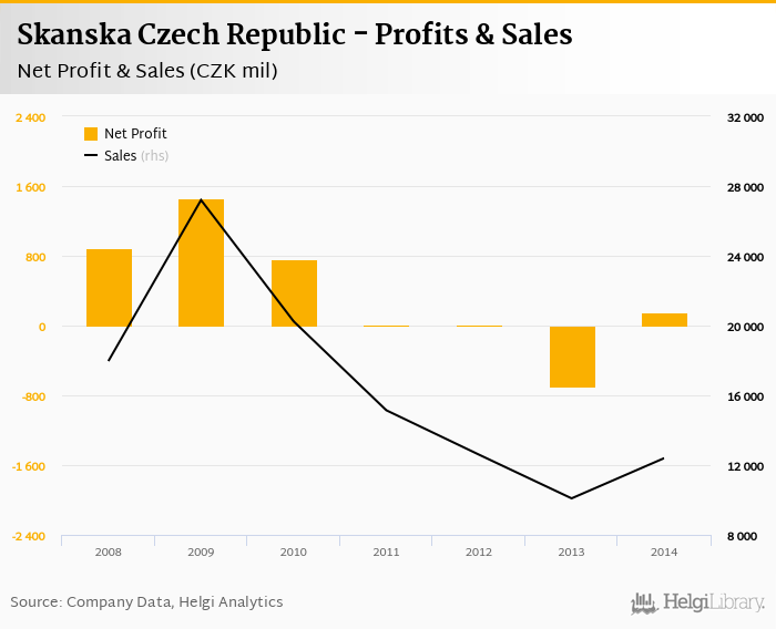 As far as Skanska Czech Republic's peers are concerned, Strabag Czech Republic posted a net profit and sales of CZK 99.7 mil and CZK 11,071 mil in 2014, Metrostav generated a net profit of CZK 533 mil (with sales of CZK 30,532 mil), and Eurovia Czech Republic netted USD CZK 221 mil (sales of CZK 11,584 mil).