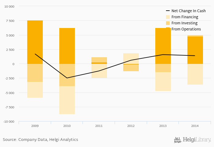 Cash from financing amounted to SEK -3,609 mil, so the company generated SEK 1,379 mil net cash in 2014.