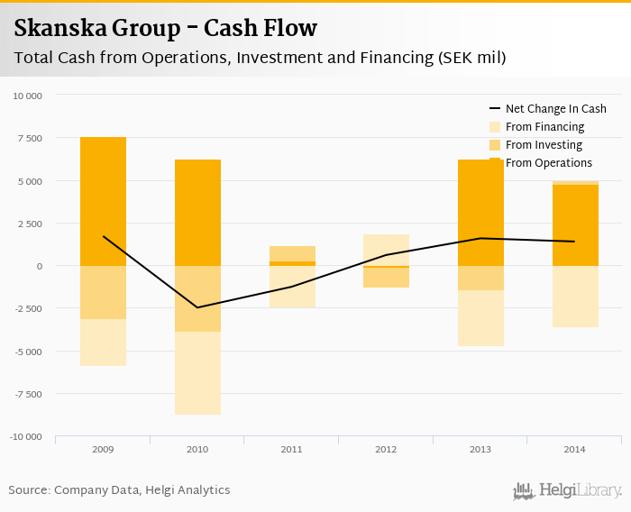 Skanska Group's operating cash flow stood at SEK 4,756 mil in 2014, down 23.9% when compared to the previous year. Historically, between 2009 - 2014, the firm’s operating cash flow reached a high of SEK 7,585 mil in 2009 and a low of SEK -91.0 mil in 2012.