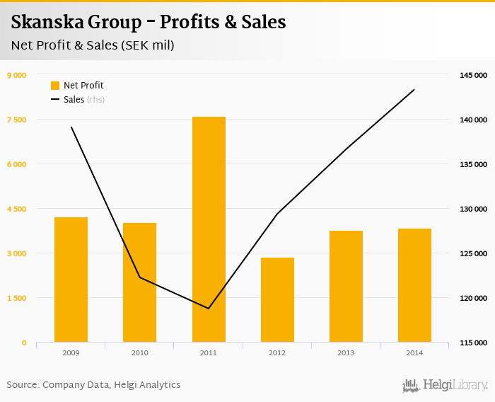 Skanska Group made a net profit of SEK 3,843 mil in 2014, up 2.07% compared to the previous year. Total sales reached SEK 143,325 mil, which is up 4.93% when compared to the previous year.