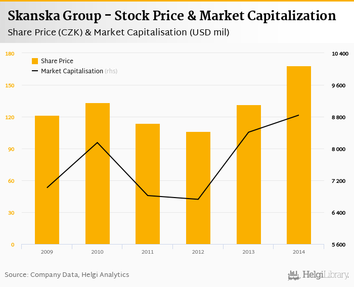 Skanska Group stock traded at CZK 168 per share at the end 2014 implying a market capitalization of USD 8,841 mil.