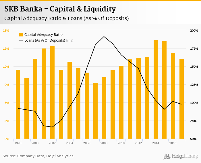 SKB Banka's capital adequacy ratio reached 13.3% at the end of 2017, down from 14.3% compared to the previous year. Historically, the bank’s capital ratio hit an all time high of 16.4% in 2014 and an all time low of 9.32% in 2007.