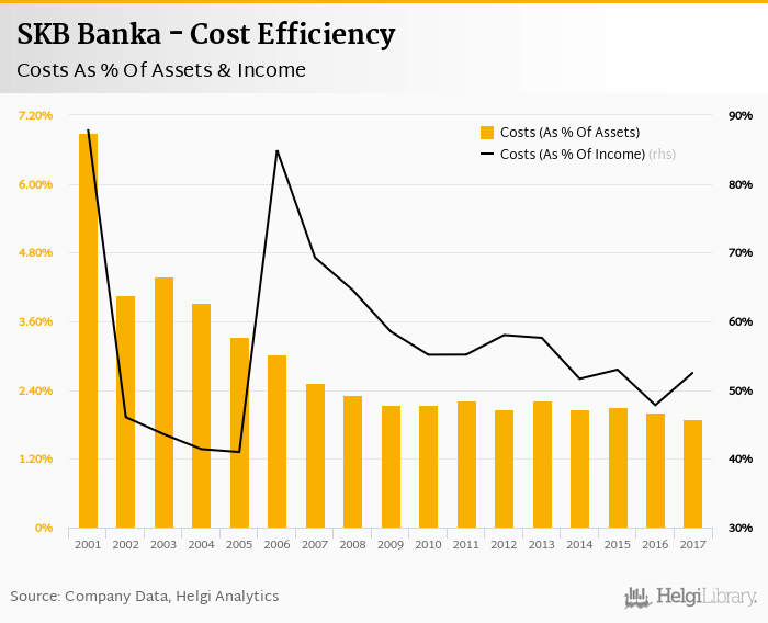 Comparing SKB Banka with its closest peers, NKBM Group operated in 2017 with a cost to income ratio of 83.3% in 2017, and UniCredit Bank Slovenia reached 64.1%.