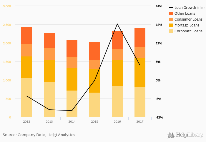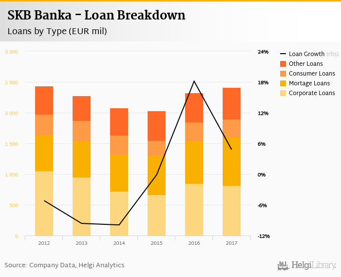 Mortgage loans represented 32.6% of the bank's loan book at the end of the year 2017, consumer further 12.1% and corporate loans 33.9% of total loans.