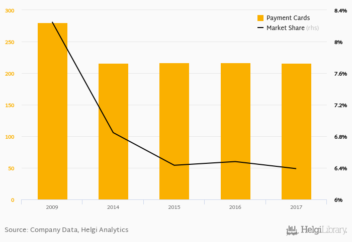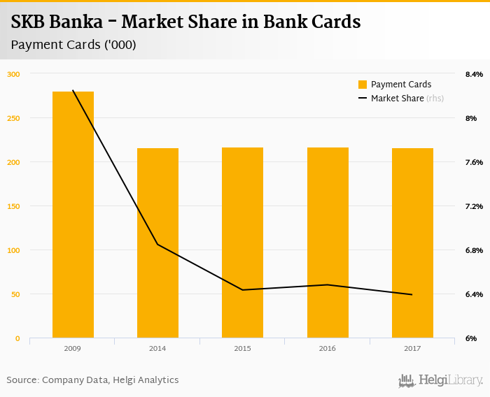 SKB Banka therefore accounted for 6.39% of all bank cards issued by banks in Slovenia at the end of 2017. Historically, the bank’s market share in payment cards reached an all time high of 8.25% in 2009 and an all time low of 6.39% in 2017.