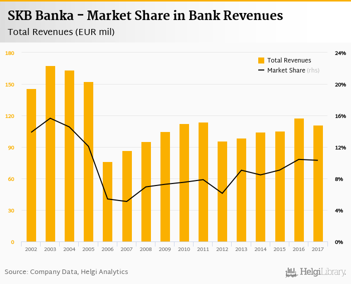 SKB Banka generated total banking revenues of EUR 111 mil in 2017, down 5.76% compared to the previous year.