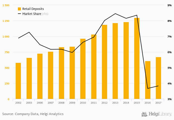 SKB Banka accounted for 3.83% of all retail deposits taken by banks in Slovenia at the end of 2017. Historically, the bank’s market share in retail deposits reached an all time high of 8.45% in 2013 and an all time low of 3.67% in 2016.