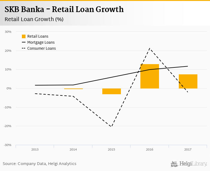 SKB Banka's retail loans reached EUR 1,078 mil at the end of 2017, up 7.56% compared to the previous year. In the last decade, the average annual loan growth amounted to 0%.