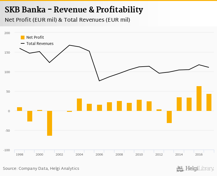 SKB Banka made a net profit of EUR 43.4 mil under revenues of EUR 111 mil in 2017, up -31.9% and -5.76% respectively compared to the previous year.