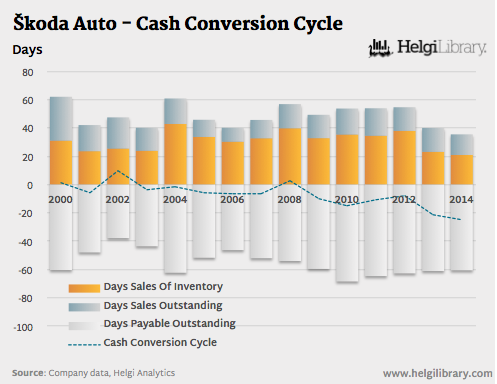 The Company has got a market power and knows how to use it, as seen at the cash conversion cycle. In 2014, the cycle took negative 25 days meaning the Company pays its suppliers nearly a month after it obtains the money for its cars sold.
