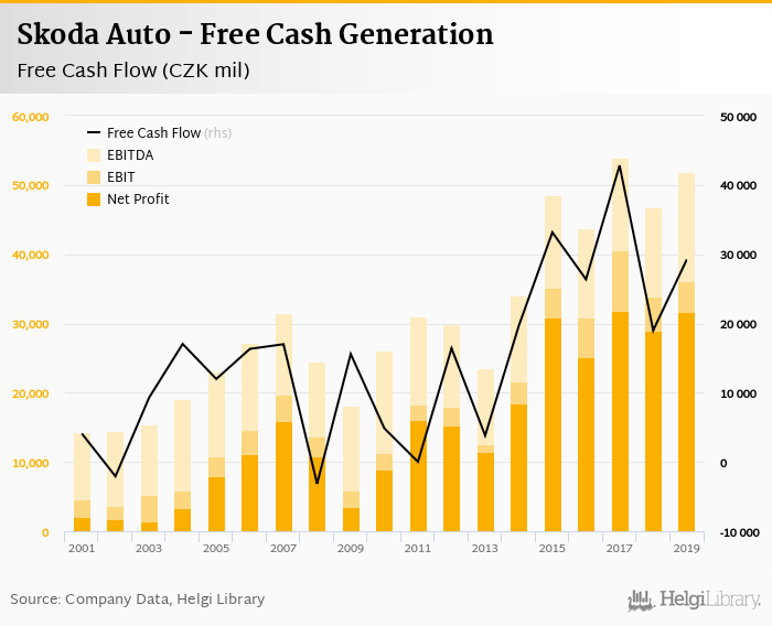 The company generated cash, defined by a sum of net profit and depreciation, of CZK 47,446 mil or 10.3% of sales. When investments are excluded, free cash flow reached CZK 29,239 mil, or 6.37% of sales in 2019.
