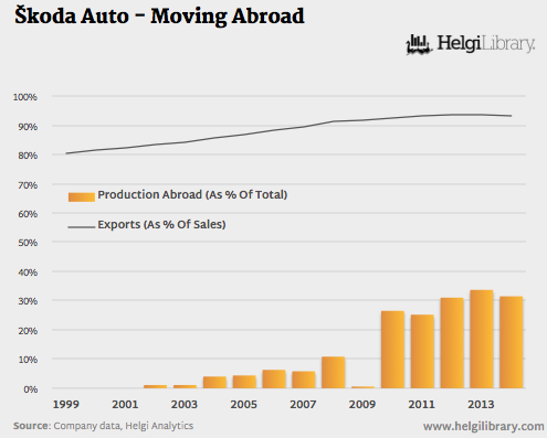 In 2014, Skoda Auto sold more than 1 million cars for the first time reaching a market share of 1.6% worldwide. That is compared to only 210,000 cars, the Company sold in 1995. The Company sold more than 93% of its production abroad in 2014, up from 80% in 1999. With more than 281,000 cars sold in 2014, China has become the single biggest market for Skoda Auto. This represents more than 27% of total Skoda cars sold in 2014. In Germany, nearly 150,000 cars has been sold in 2014, or 14% of total Skoda cars produced. The data presented in the chart could be downloaded in the Companies section at www.helgilibrary.com/companies/index/skoda-auto