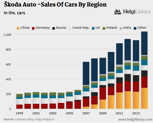 In 2014, Škoda Auto sold more than 1 million cars for the first time reaching a market share of 1.6% worldwide. That is compared to only 210,000 cars, the Company sold in 1995. With more than 281,000 cars sold in 2014, China has become the single biggest market for Skoda Auto. This represents more than 27% of total Skoda cars sold in 2014. In Germany, nearly 150,000 cars has been sold in 2014, or 14% of total Skoda cars produced. The data presented in the chart could be downloaded in the Companies section at www.helgilibrary.com/companies/index/skoda-auto