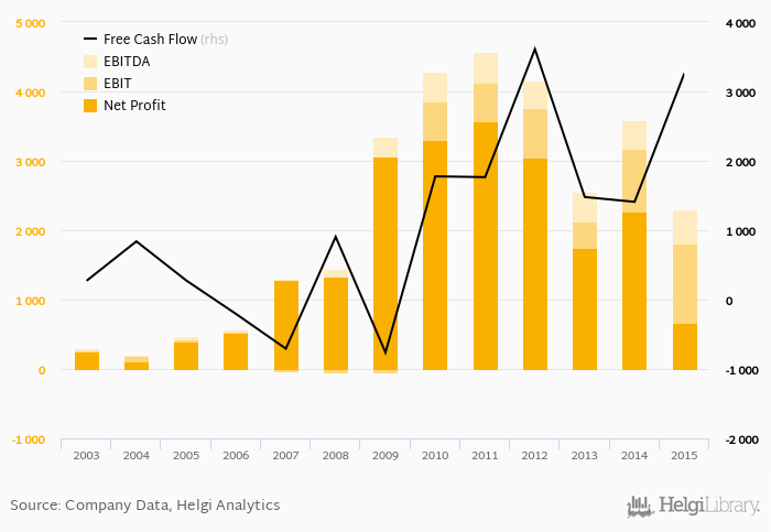 The company generated cash, defined by a sum of net profit and depreciation, of CZK 1,168 mil or 6.39% of sales. When investments are excluded, free cash flow reached CZK 3,262 mil, or 17.8% of sales in 2015.