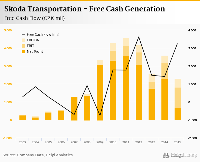 Skoda Transportation made a net profit of CZK 674 mil with revenues of CZK 18,279 mil in 2015, down by 70.4% and up by 11.7%, respectively, compared to the previous year. This translates into a net margin of 3.69%.