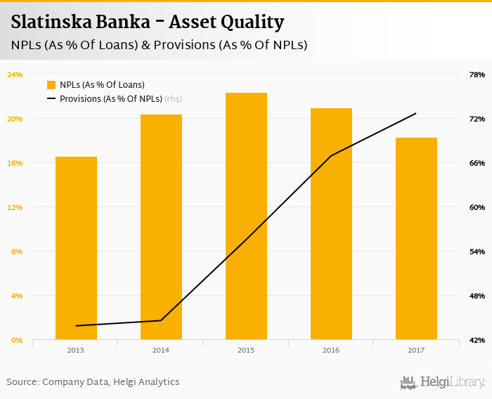 Slatinska Banka's non-performing loans reached 18.3% of total loans at the end of 2017, down from 20.9% compared to the previous year. Historically, the NPL ratio hit an all time high of 22.4% in 2015 and an all time low of 16.6% in 2013.