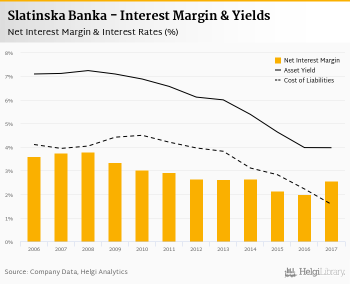 Slatinska Banka's net interest margin amounted to 2.56% in 2017, up from 1.99% compared to the previous year.