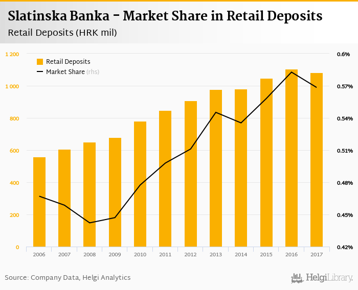 Slatinska Banka accounted for 0.568% of all retail deposits taken by banks in Croatia at the end of 2017. Historically, the bank’s market share in retail deposits reached an all time high of 0.583% in 2016 and an all time low of 0.442% in 2008.