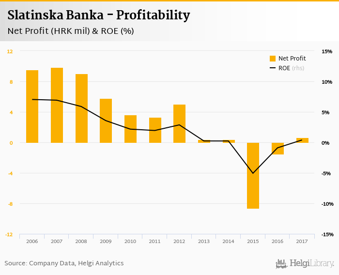 Slatinska Banka made a net profit of HRK 0.649 mil in 2017, up 143% compared to the previous year. This implies a return on equity of 0.390%.