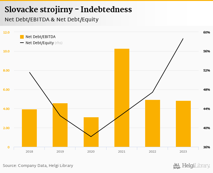 Slovacke strojirny's net debt stood at CZK 630 mil and accounted for 58.7% of equity at the end of 2023. The ratio is up 11.3 pp compared to the previous year.