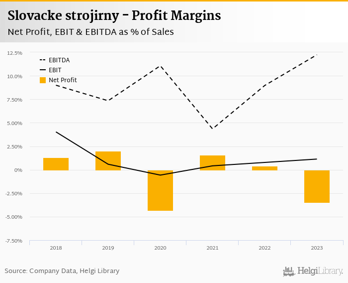 Slovacke strojirny made a net profit of CZK -37.0 mil with revenues of CZK 1,061 mil in 2023, down by 889% and down by 10.8%, respectively, compared to the previous year.