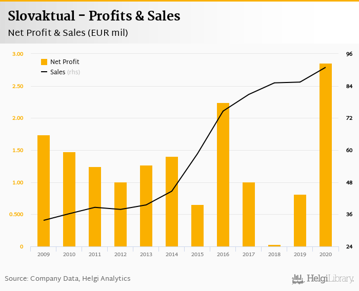 Slovaktual made a net profit of EUR 2.86 mil in 2020, up 253% compared to the previous year. Total sales reached EUR 91.0 mil, which is up 6.48% when compared to the previous year.