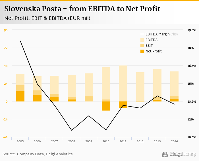 As far as Slovenska Posta's peers are concerned, Ceska Posta posted net and EBITDA margin of 1.10% and 5.83%, respectively in 2014, Austrian Post generated margins of 6.18% and 14.1% and Deutsche Post DHL profit margin reached 3.66% on the net and 7.67% on the EBITDA level in 2019.