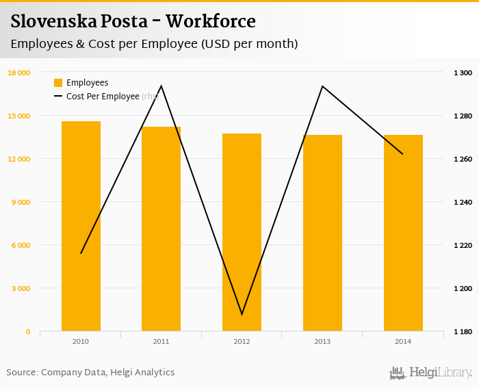 Slovenska Posta employed 13,652 employees in 2014, down 0.044% compared to the previous year. Historically, between 2010 and 2014, the firm's workforce hit a high of 14,601 employees in 2010 and a low of 13,652 employees in 2014.