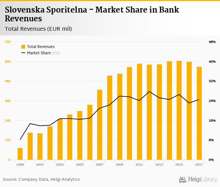 As a result, Slovenska Sporitelna accounted for 24.5% of all bank revenues generated by banks in Slovakia in 2017. Historically, the bank’s market share in total revenues reached an all time high of 27.7% in 2012 and an all time low of 8.17% in 1999.