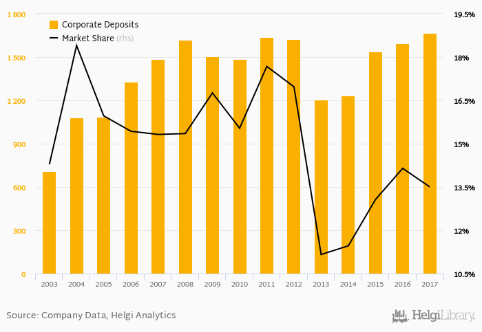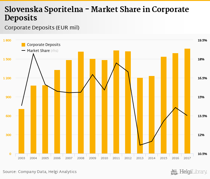Slovenska Sporitelna accounted for 13.5% of all corporate deposits taken by banks in Slovakia at the end of 2017. Historically, the bank’s market share in corporate deposits reached an all time high of 18.4% in 2004 and an all time low of 11.2% in 2013.