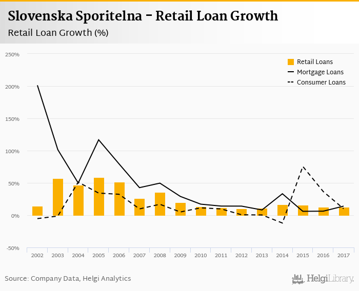 Slovenska Sporitelna's retail loans reached EUR 9,161 mil at the end of 2017, up 13.0% compared to the previous year. In the last decade, the average annual loan growth amounted to 15.8%.