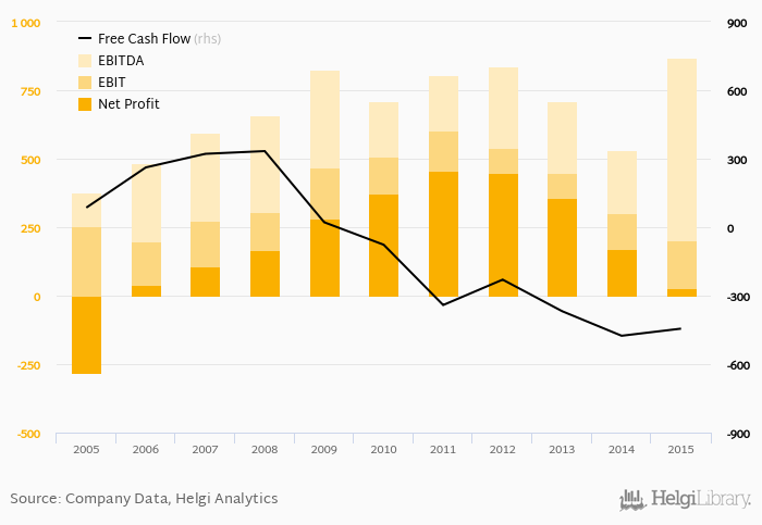 The company generated cash, defined by a sum of net profit and depreciation, of EUR 693 mil or 29.3% of sales. When investments are excluded, free cash flow reached EUR -444 mil, or -18.8% of sales in 2015.
