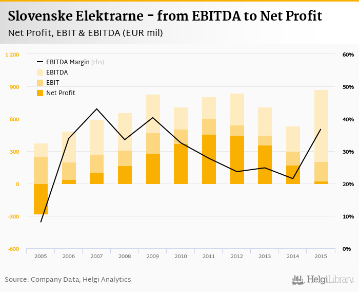Slovenske Elektrarne made a net profit of EUR 26.1 mil with revenues of EUR 2,362 mil in 2015, down by 84.6% and down by 4.49%, respectively, compared to the previous year. This translates into a net margin of 1.11%.