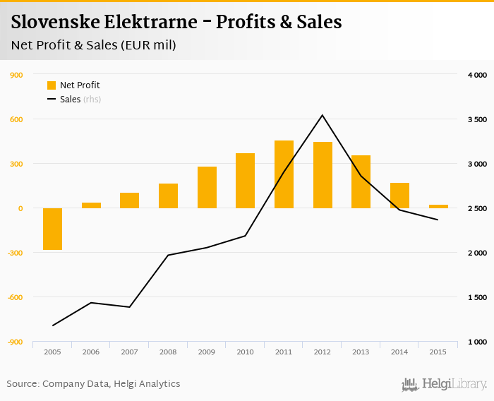 Slovenske Elektrarne made a net profit of EUR 26.1 mil in 2015, down 84.6% compared to the previous year. Total sales reached EUR 2,362 mil, which is down 4.49% when compared to the previous year.