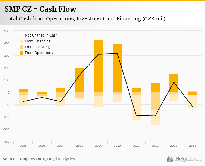 SMP CZ's operating cash flow stood at CZK -21.3 mil in 2014, down 114% when compared to the previous year. Historically, between 2005 - 2014, the firm’s operating cash flow reached a high of CZK 429 mil in 2009 and a low of CZK -21.3 mil in 2014.