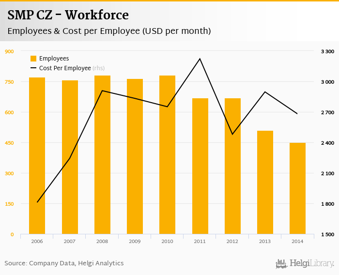 SMP CZ employed 449 employees in 2014, down 12% compared to the previous year. Historically, between 2006 and 2014, the firm's workforce hit a high of 781 employees in 2010 and a low of 449 employees in 2014.