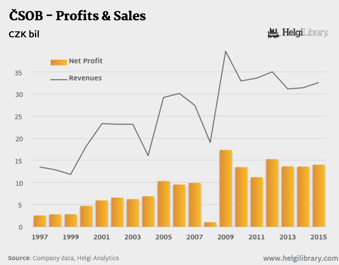 The bank was privatized in 1999, when Belgium’s KBC became the majority owner (and sole owner in 2007). Since 2003, ČSOB's net profit has increased more than fourfold and the bank's ROE exceeded 17% on average in 2006-2015. The bank is well capitalized and funded and has been lending cautiously.