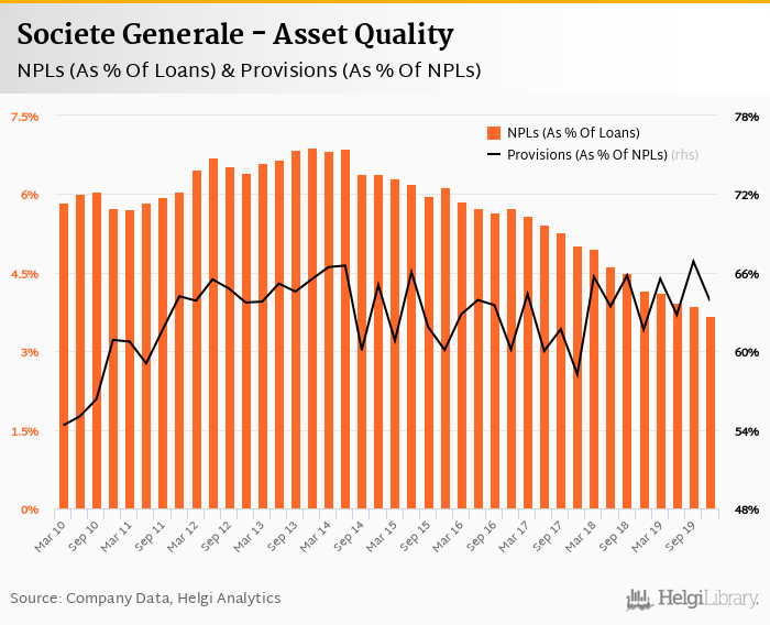 Societe Generale's non-performing loans reached 3.67% of total loans at the end of 2019-12-31, down from 4.16% compared to the previous year. Historically, the NPL ratio hit an all time high of 6.89% in 2013-12-31 and an all time low of 3.67% in 2019-12-31.