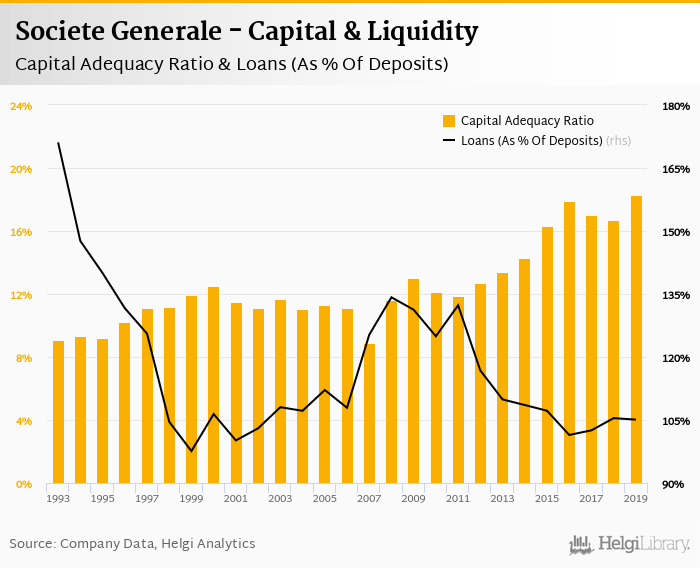 Societe Generale's capital adequacy ratio reached 18.3% at the end of 2019, up from 16.7% compared to the previous year. Historically, the bank’s capital ratio hit an all time high of 18.3% in 2019 and an all time low of 8.87% in 2007.