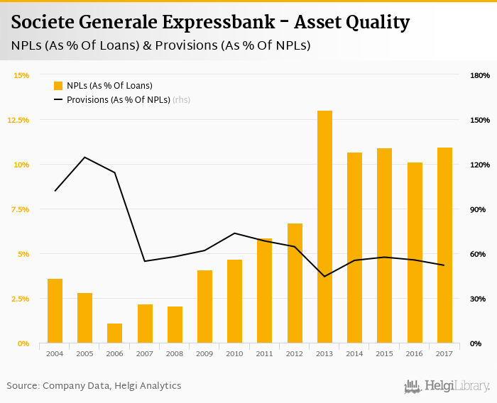 Societe Generale Expressbank's non-performing loans reached 10.9% of total loans at the end of 2017, up from 10.1% compared to the previous year. Historically, the NPL ratio hit an all time high of 13.0% in 2013 and an all time low of 1.10% in 2006.