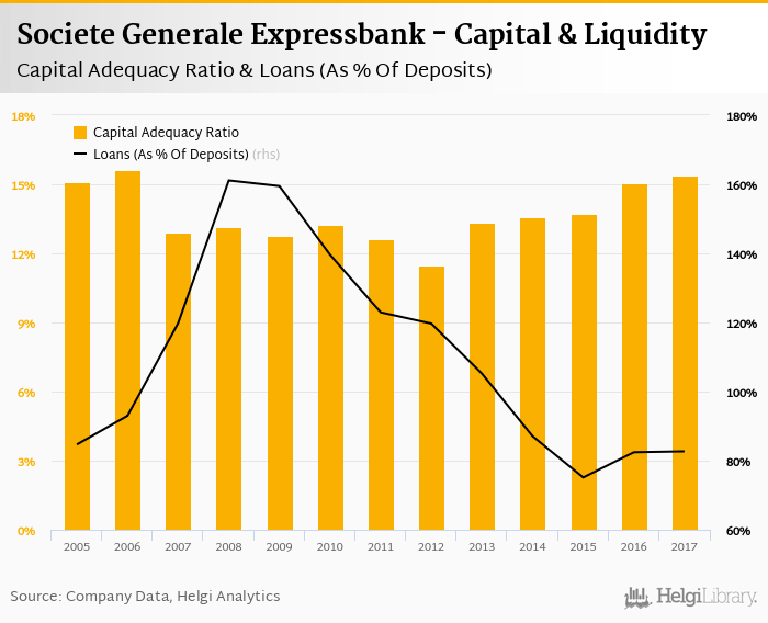 Comparing Societe Generale Expressbank with its closest peers, DSK Bank ended the year 2017 with a capital adequacy ratio at 17.1% and loans to deposits of 66.2%, United Bulgarian Bank with 24.3% and 56.0% respectively and Raiffeisenbank Bulgaria some 31.6% in terms of capital adequacy and 82.2% of loans to deposits at the end of 2017.
