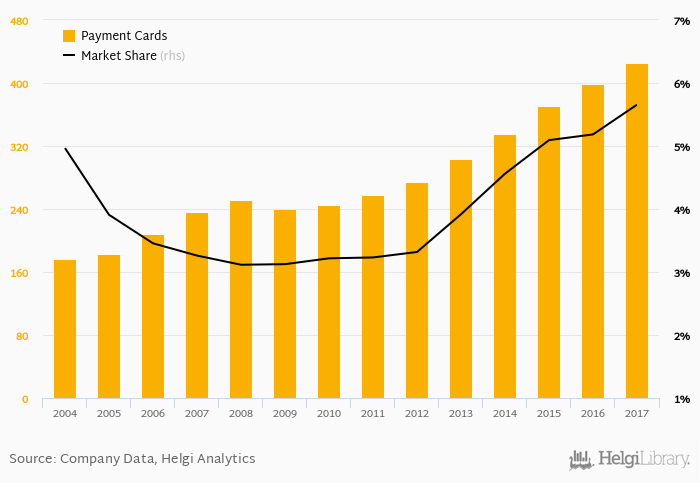 Societe Generale Expressbank therefore accounted for 5.66% of all bank cards issued by banks in Bulgaria at the end of 2017. Historically, the bank’s market share in payment cards reached an all time high of 5.66% in 2017 and an all time low of 3.12% in 2008.