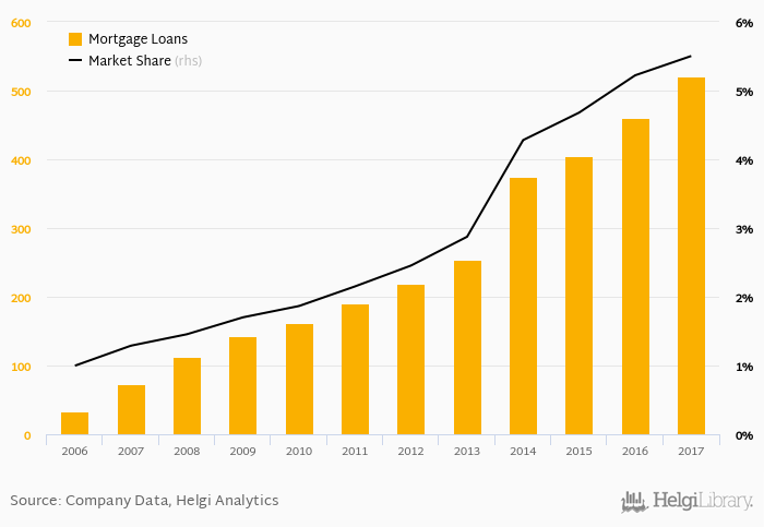 Societe Generale Expressbank accounted for 5.50% of all mortgage loans issued in Bulgaria at the end of 2017. Historically, the bank’s market share in mortgage loans reached an all time high of 5.50% in 2017 and an all time low of 0.997% in 2006.